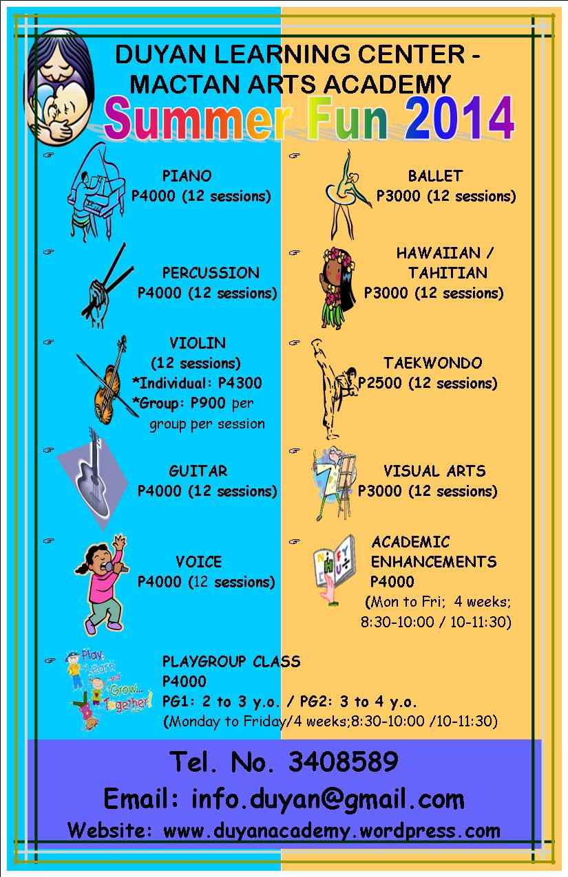Summer Fun 2014 March 6, 2014 · by duyanadmin · Bookmark the permalink. · Piano Percussion Ballet Hawaiian/Tahitian Violin Taekwondo Guitar Visual Arts Voice Academic Enhancement Playgroup class Share this: Share on X (Opens in new window) X Share on Facebook (Opens in new window) Facebook Like Loading... Related